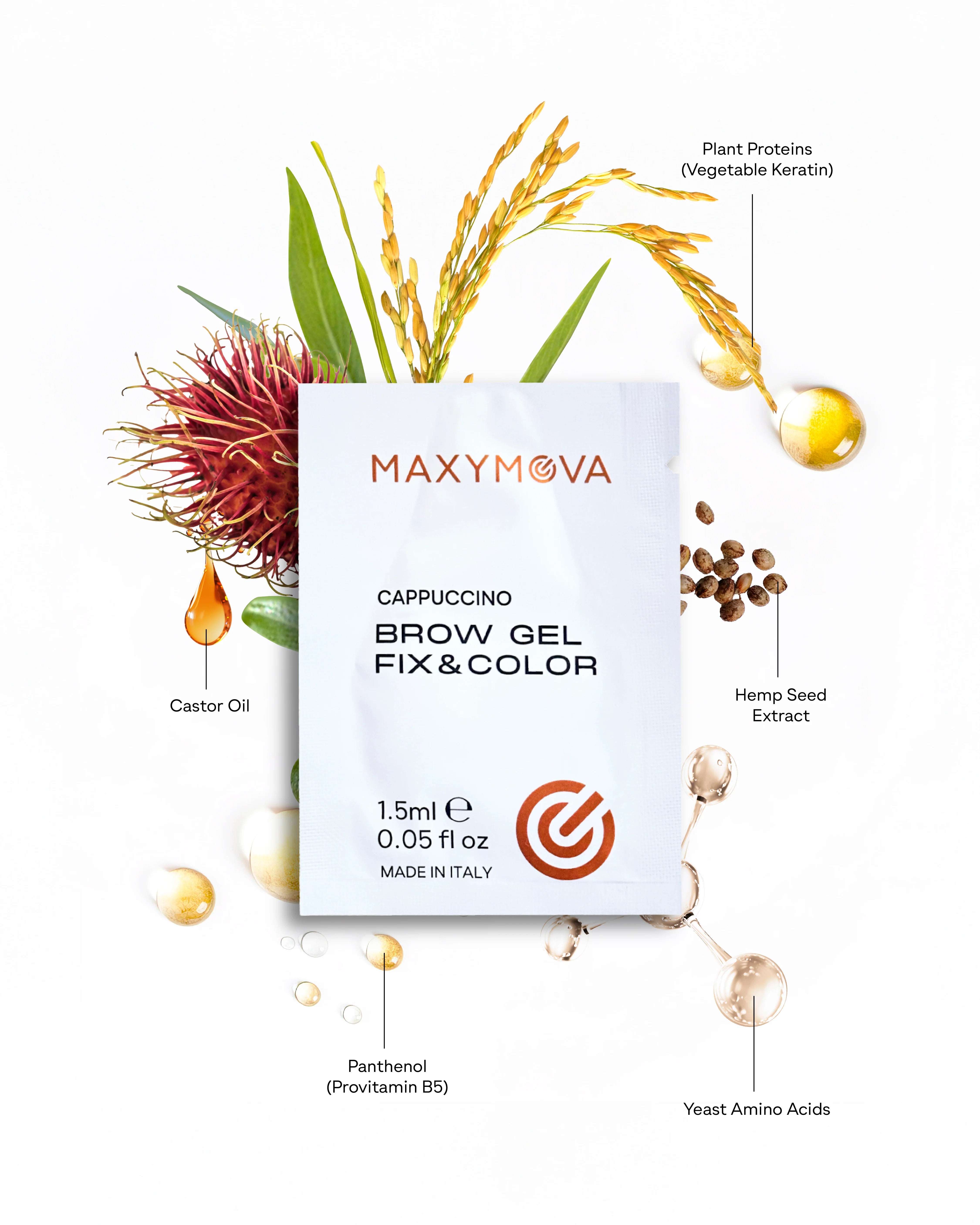 Fórmula Trial-Action*: peinado + color + cuidado posterior al laminado. Define, tiñe y da forma a tus cejas en segundos con gel para cejas MAXYMOVA, tu nuevo producto de belleza imprescindible para unas cejas impecables y con volumen que duran todo el día. Tanto si deseas un peinado natural como uno más atrevido, nuestro gel fácil de usar mantiene cada pelo en su sitio sin dejarlo rígido ni con residuos. Su textura ligera se seca rápidamente y proporciona fijación, volumen y color instantáneos con una sola pasada. Elige tu tono perfecto: –Cappuccino– Un marrón cálido para tonos suaves y bronceados. –Cacao– Un marrón oscuro para unas cejas profundas y definidas. –Moka– Negro intenso para una definición fuerte y llamativa.