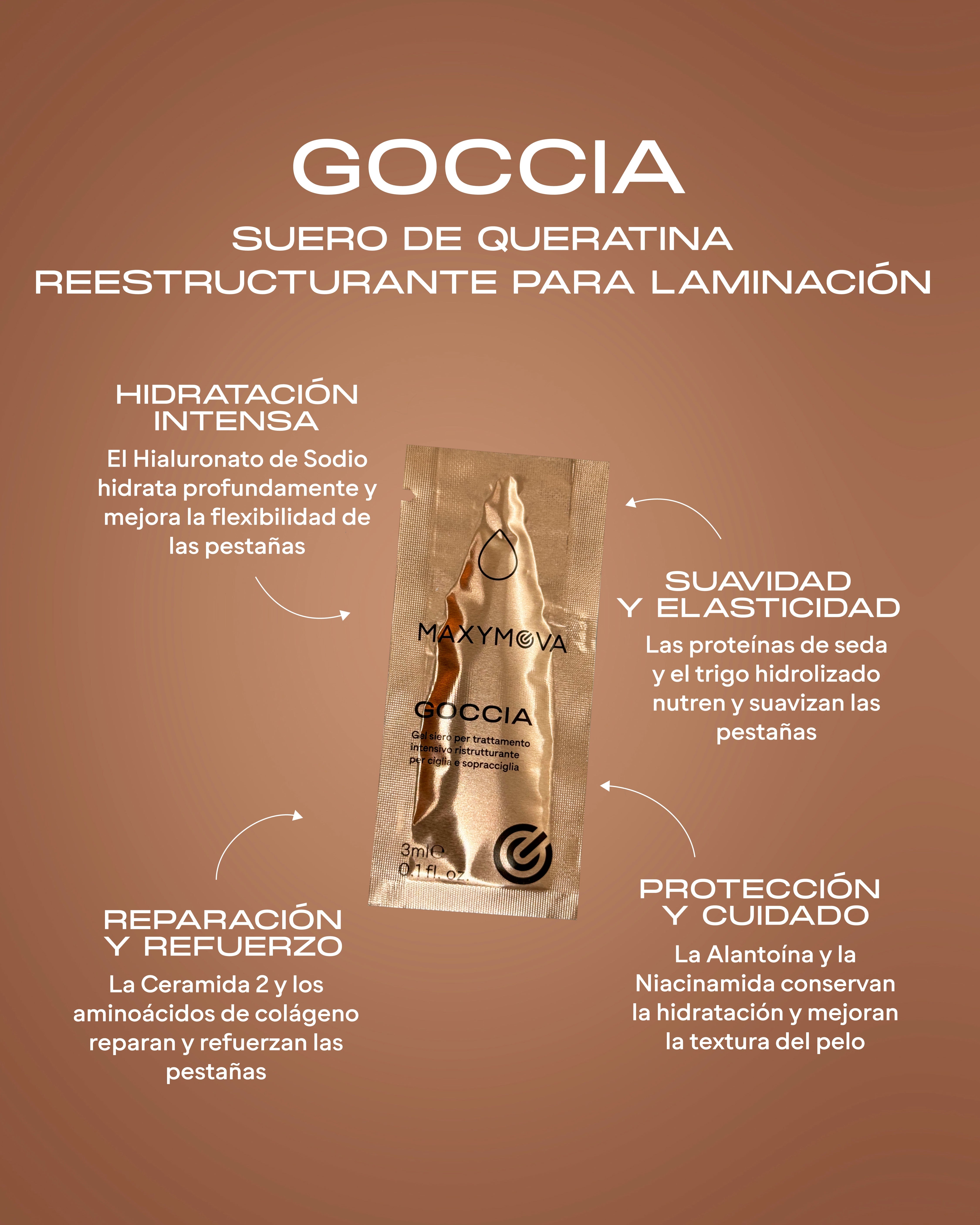 ¿Quieres probar un nuevo sistema de laminación? ¿Por qué no pruebas el Kit de Descubrimiento de Salón MAXYMOVA? Incluye todos los pasos necesarios para transformar las pestañas y cejas de tus clientas sin tener que comprar envases o sobres más grandes. Productos profesionales MAXYMOVA para la laminación de pestañas y cejas. Desarrollados en colaboración con los mejores fabricantes de laminación de Italia. Un laboratorio independiente, en colaboración con la Universidad de Padua, ha confirmado la eficacia del procedimiento de laminación de pestañas MAXYMOVA. Tras tres sesiones, observamos un aumento promedio del 26 % en el diámetro de las pestañas y del 19 % en el ángulo de curvatura (+40,42°). Estamos orgullosos del hecho de que todos nuestros productos cumplen con los más altos estándares de calidad europeos e italianos y, con un uso profesional correcto y constante, tanto las pestañas como los pelos de las cejas mantienen una calidad excelente. Kit compuesto por: Sobre de 1,5 ml de LIFT MAXYMOVA® Paso 1Sobre de 1,5 ml de FIX MAXYMOVA® Paso 2Sobre de 3 ml de sérum reestructurante GOCCIA/GOCCIA BLUE DIAMOND1 sobre monodosis de 1,5 ml de Lash&Brow Cocktail (fluido final, equivalente al Paso 3) / 1 sobre monodosis de 1,5 ml de Step 3 HYDRATION &KERATIN BOOSTER¡Elige la GOCCIA que prefieras!